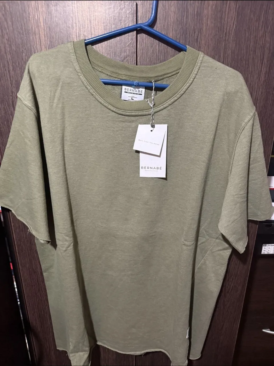 Remera de algodón color verde militar, con cuello redondo y mangas cortas. Diseño oversize con terminaciones deshilachadas en mangas y ruedo. Ideal para un look casual y relajado.