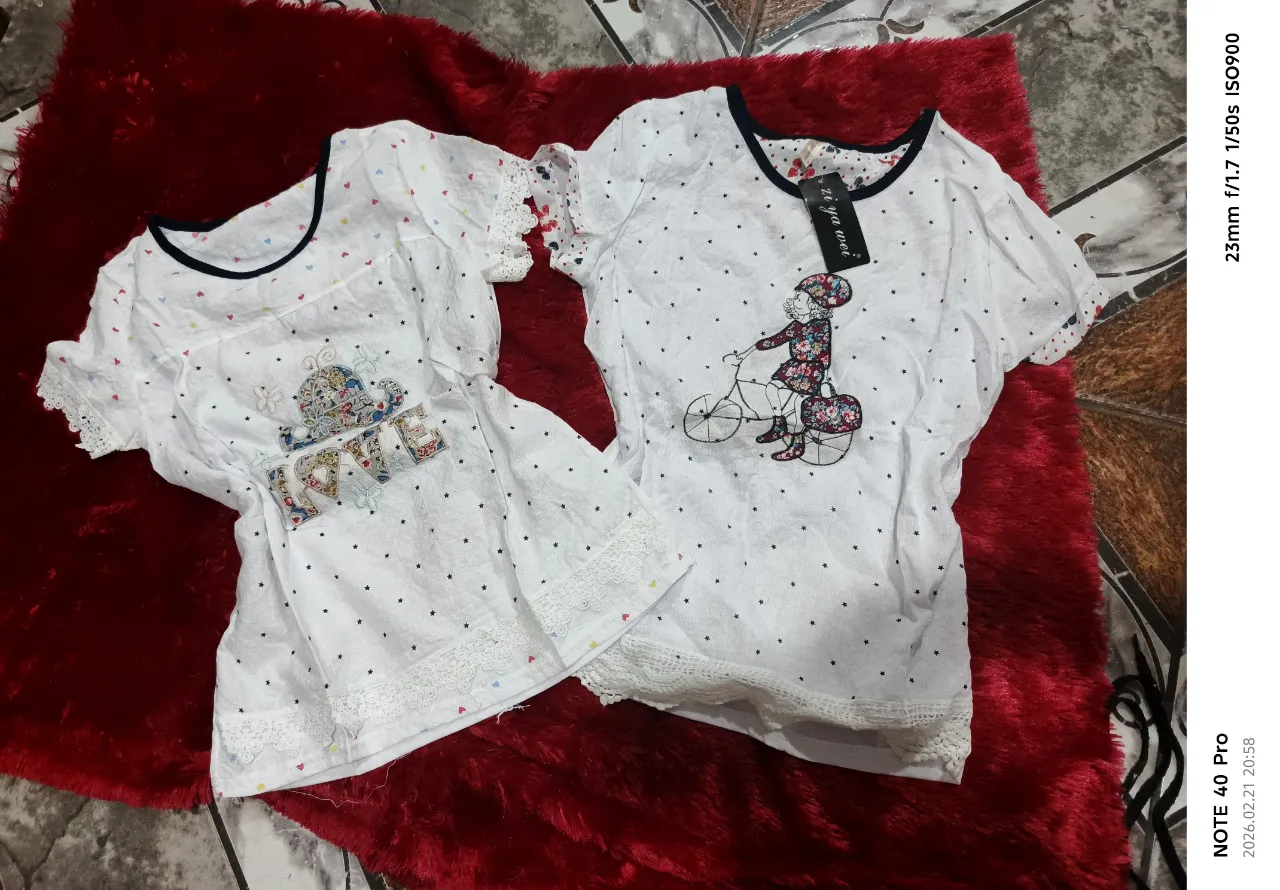 Conjunto de dos remeras blancas con estampa de estrellas y corazones. Una tiene la palabra "LOVE" bordada y la otra una nena andando en bicicleta. Ambas con detalles de puntilla en mangas y ruedo. Ideales para el día a día o para estar cómoda en casa. EL PRECIO ES X UNIDAD