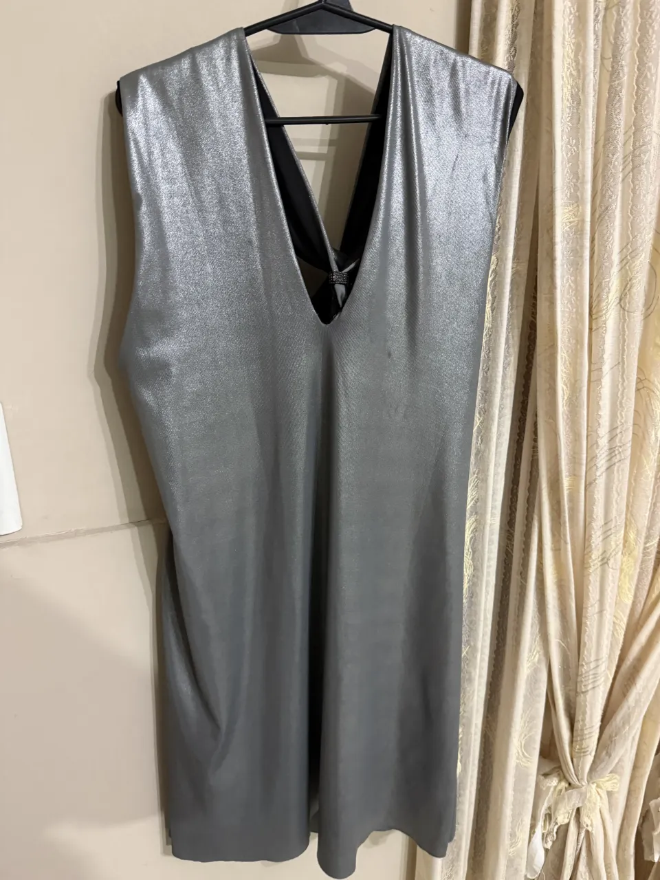 Vestido plateado con escote en V. Espalda con tiras cruzadas y piedras en la unión, detalles de uso se muestran en la imagen. el vestido es suelto