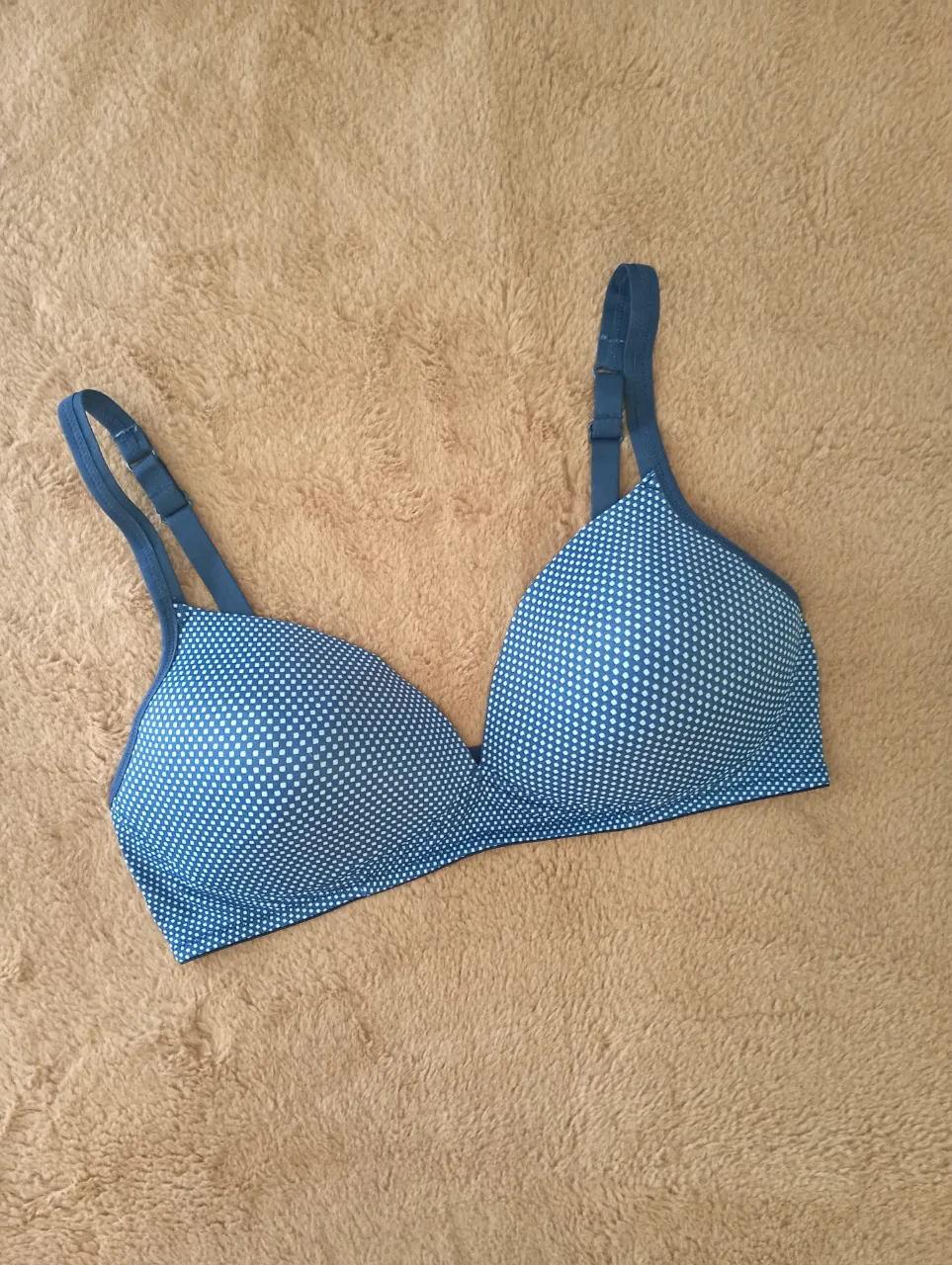 Corpiño azul importado de usa warners con estampa de pequeños cuadros blancos. Breteles finos regulables. wireless sin aro push up talle 100