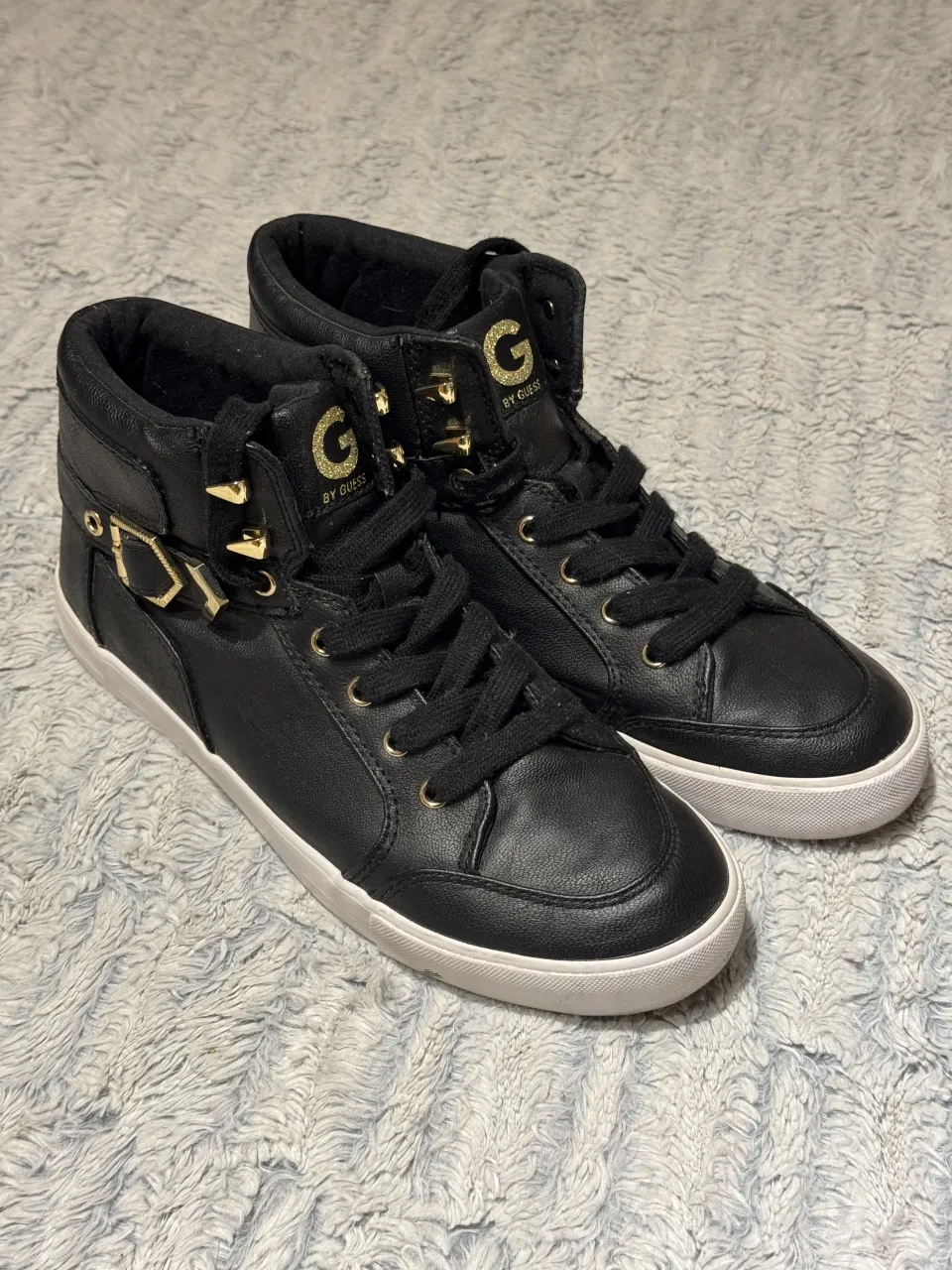 Zapatillas urbanas de caña alta, color negro con detalles dorados. Cuentan con cordones, hebilla lateral y tachas decorativas. Ideales para un look moderno y canchero.