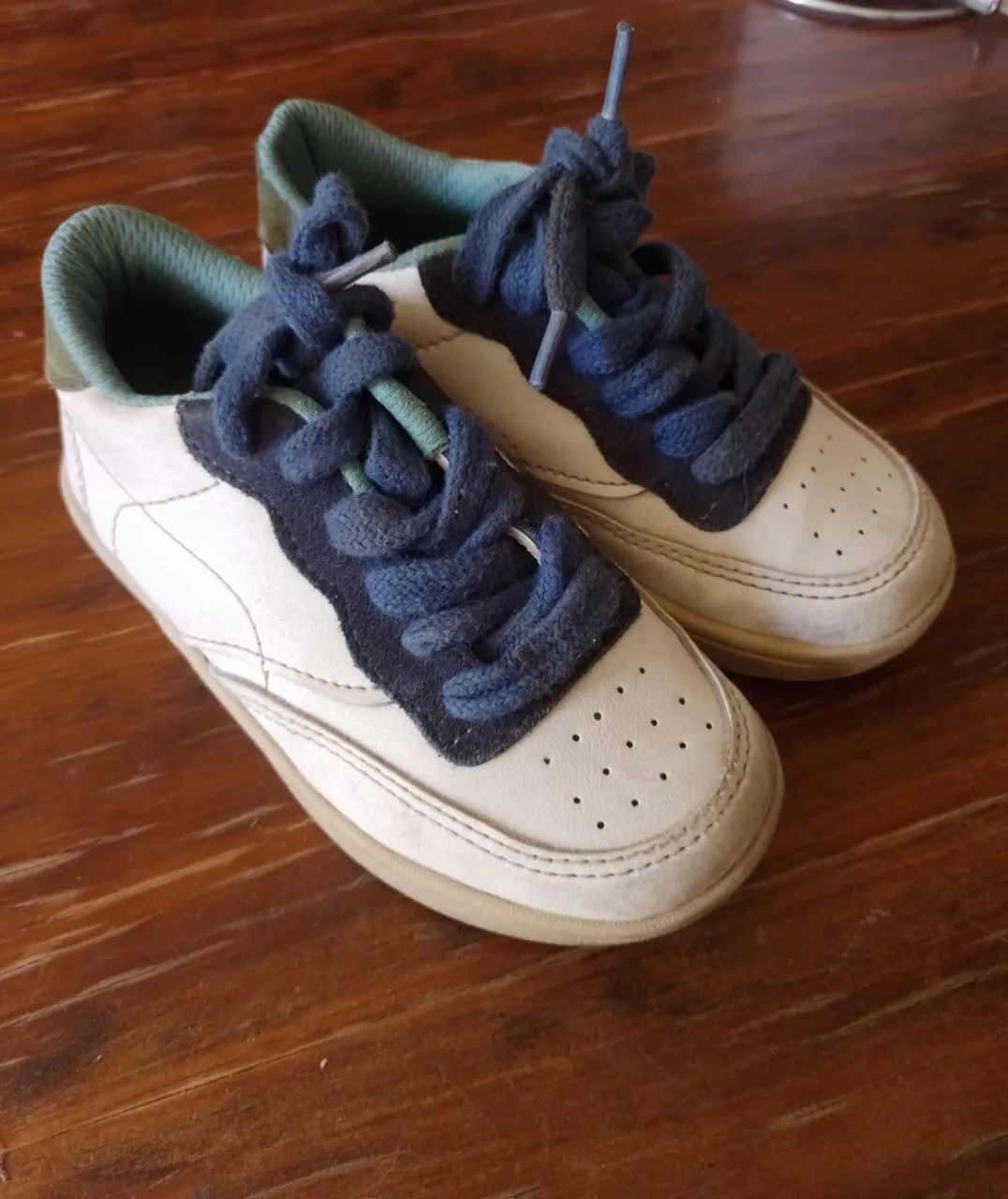 Zapatillas deportivas blancas con detalles en azul marino y verde. Ideales para un look casual y cómodo.