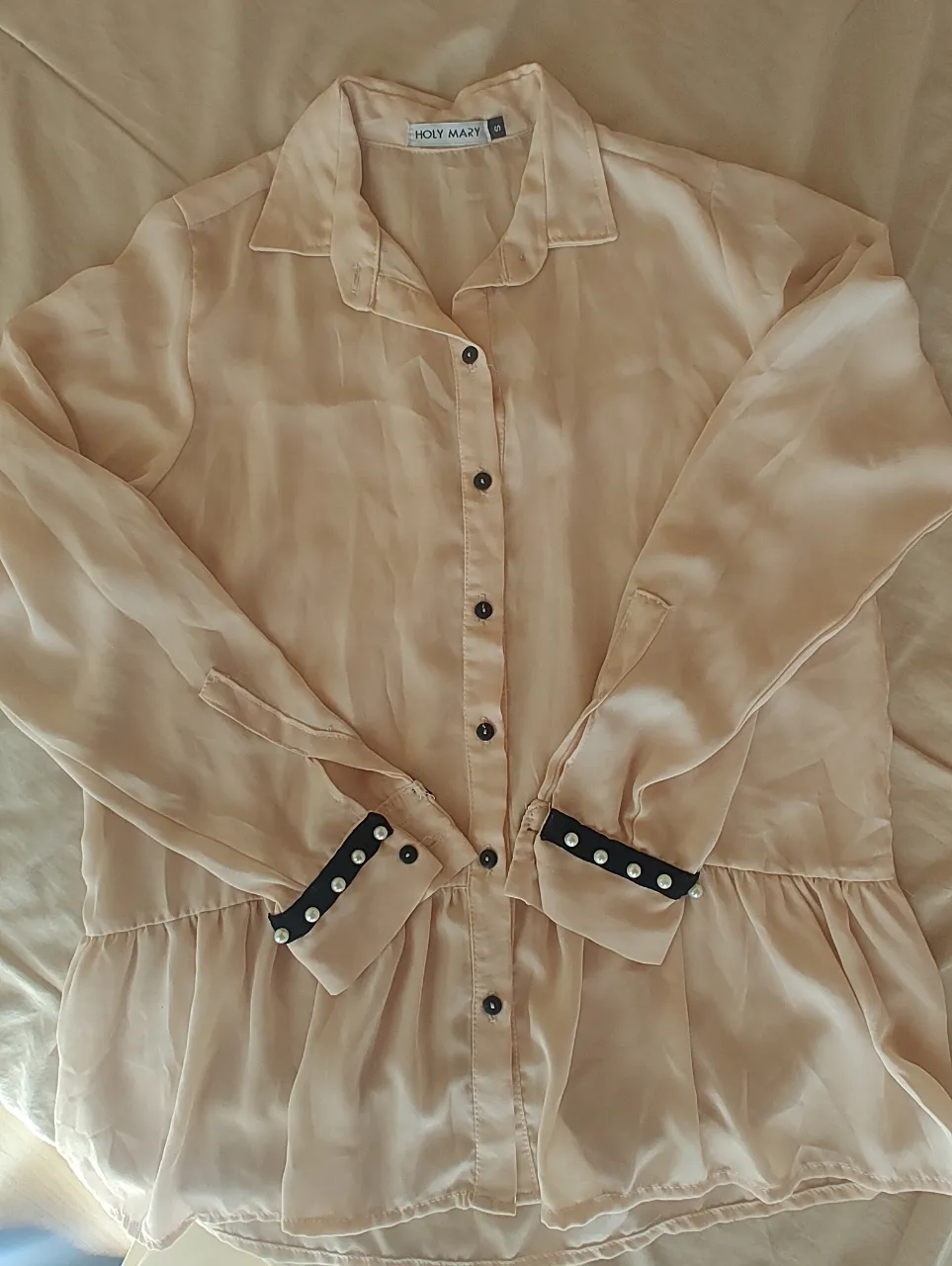 Camisa color durazno, con detalles de perlas y negro en los puños.La tela es traslúcida y tiene bolados en la parte inferior.