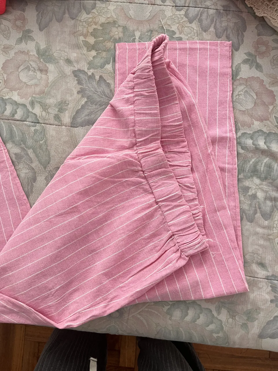 Pantalón rosa a rayas blancas, tiro alto con elástico en la cintura. Súper cómodo y canchero, ideal para un look relajado y con onda.