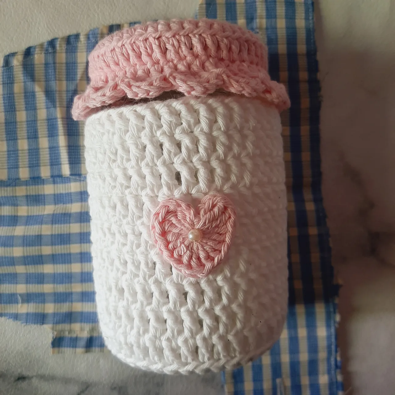 Frasco de vidrio con tejido a crochet, blanco con detalles en rosa y un corazón aplicado. Ideal para darle un toque tierno y artesanal a tu hogar.