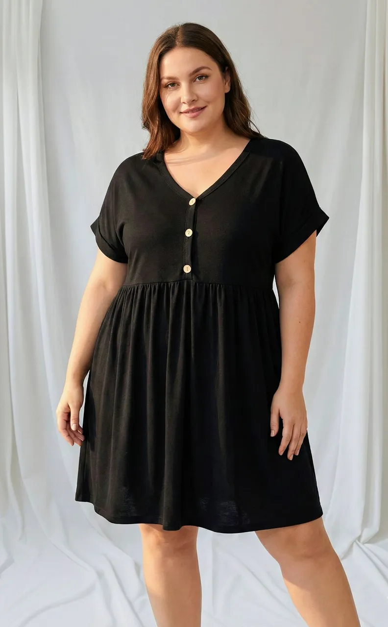 Vestido negro súper cómodo y canchero, ideal para el día a día. Tiene un corte suelto con fruncido en la cintura y detalles de botones en el escote. Perfecto para combinar con zapatillas o sandalias.