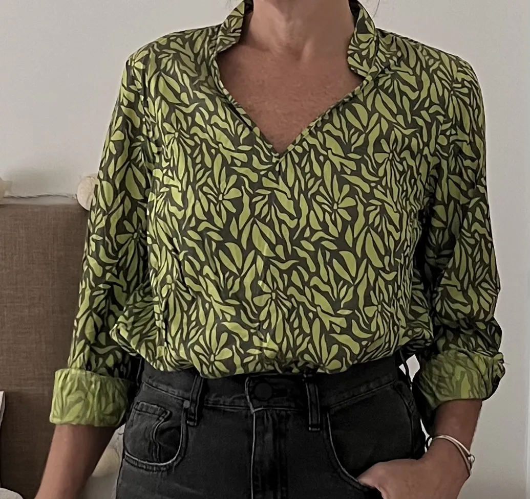 Blusa estampada con hojas en tonos verdes y marrones. Posee cuello mao y mangas largas con puños. Ideal para un look casual o elegante.