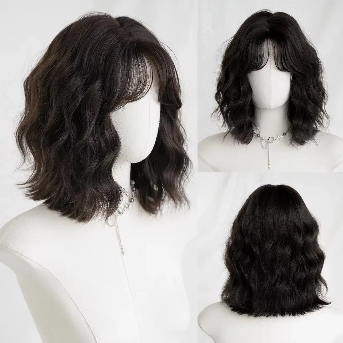 Peluca de cabello sintético color castaño oscuro con ondas suaves y flequillo. Largo hasta los hombros. Se muestra en maniquí y en modelo. Nueva e importada 🪐 fibra sintética organica similar al cabello humano termoresitente