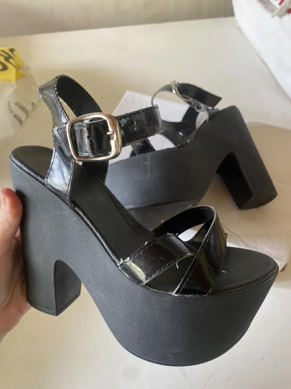 Sandalias negras con plataforma y taco grueso. Tienen tiras al tono y hebilla para ajustar. Ideales para darle un toque audaz a tu look.