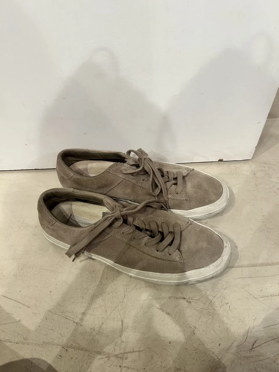 Zapatillas de gamuza color tiza con cordones y suela blanca.