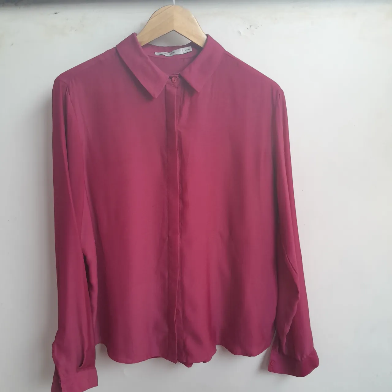 Camisa de Portsaid de color fucsia, con botanadura escondida y cuello clásico. Ideal para un look elegante y sofisticado, perfecta para eventos formales o para darle un toque chic a tu outfit de trabajo. Con un pequeño detalle se ve en la última foto.
