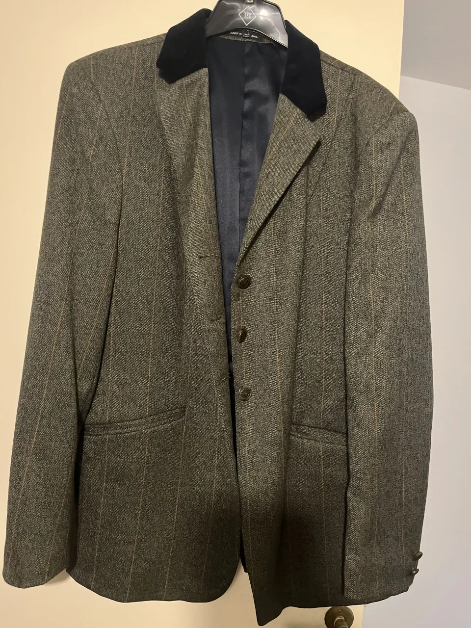 Blazer de vestir clásico, ideal para un look elegante y formal. Confeccionado en tweed con finas rayas verticales, cuello de terciopelo y botones frontales. Perfecto para ocasiones especiales o para elevar un atuendo de trabajo.