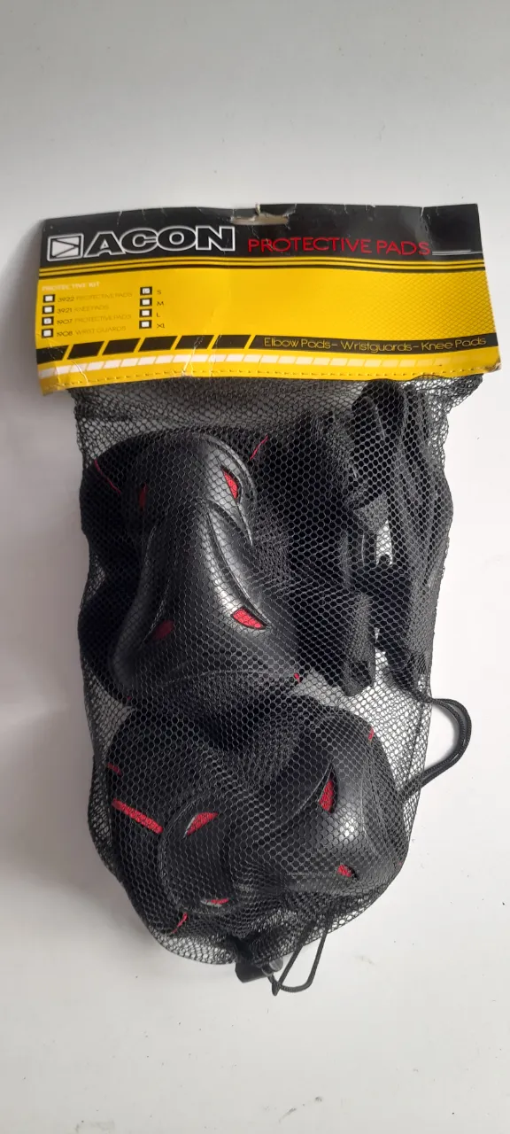 Kit de protecciones Acon para deportes extremos. Incluye rodilleras, coderas y muñequeras. Ideal para patinaje, skate y otros deportes de riesgo. Vienen en una práctica bolsa de red para transportarlas fácilmente.