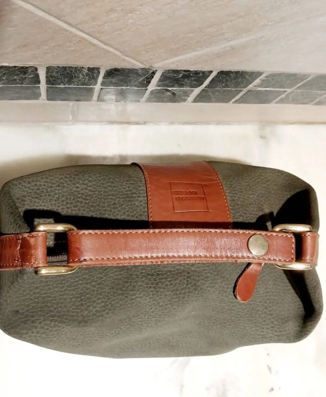 Neceser de cuero marrón y verde, con detalles de hebillas y broches dorados. Ideal para organizar tus esenciales de viaje o uso diario.