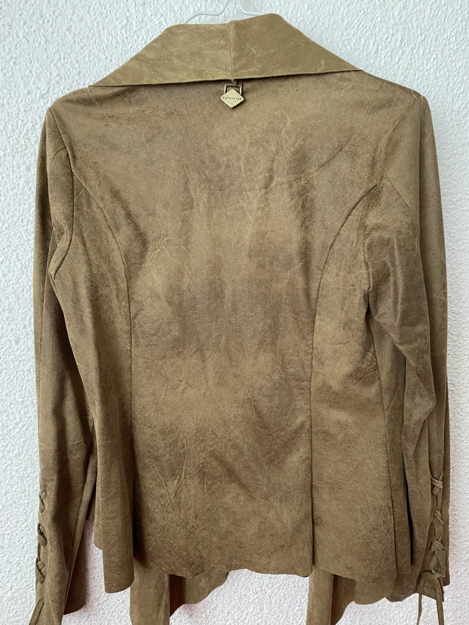 Saco de gamuza sintética color marrón. Diseño abierto con solapas amplias. Mangas largas con detalle de cordones entrelazados en los puños. La parte inferior es asimétrica con un corte tipo cascada. Sin uso.
