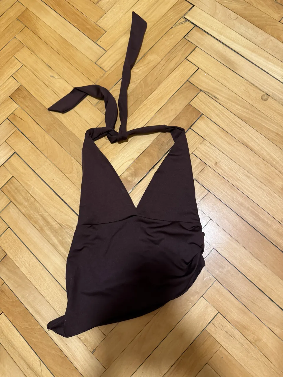 top de color marrón oscuro con tiras para atar en el cuello y espalda. Posee fruncido en la parte del busto.