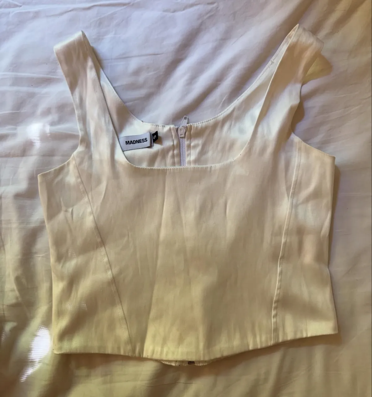 Top blanco de satén con escote cuadrado y cierre al frente. Un básico súper chic para cualquier ocasión.
