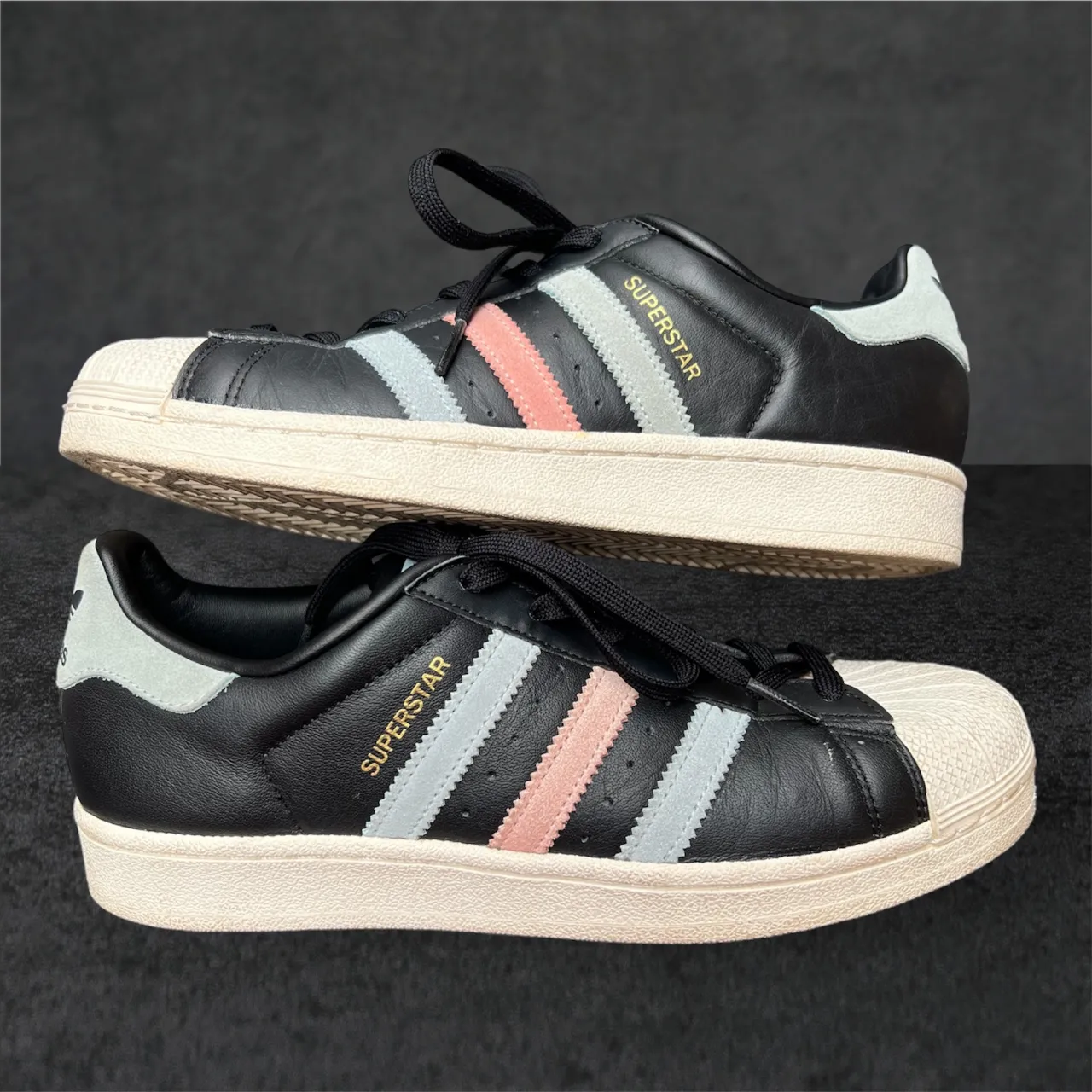 Zapatillas Adidas Superstar negras con detalles en rosa pálido y celeste claro en las tres tiras laterales y en el talón. Cierre de cordones negros y puntera de goma blanca.