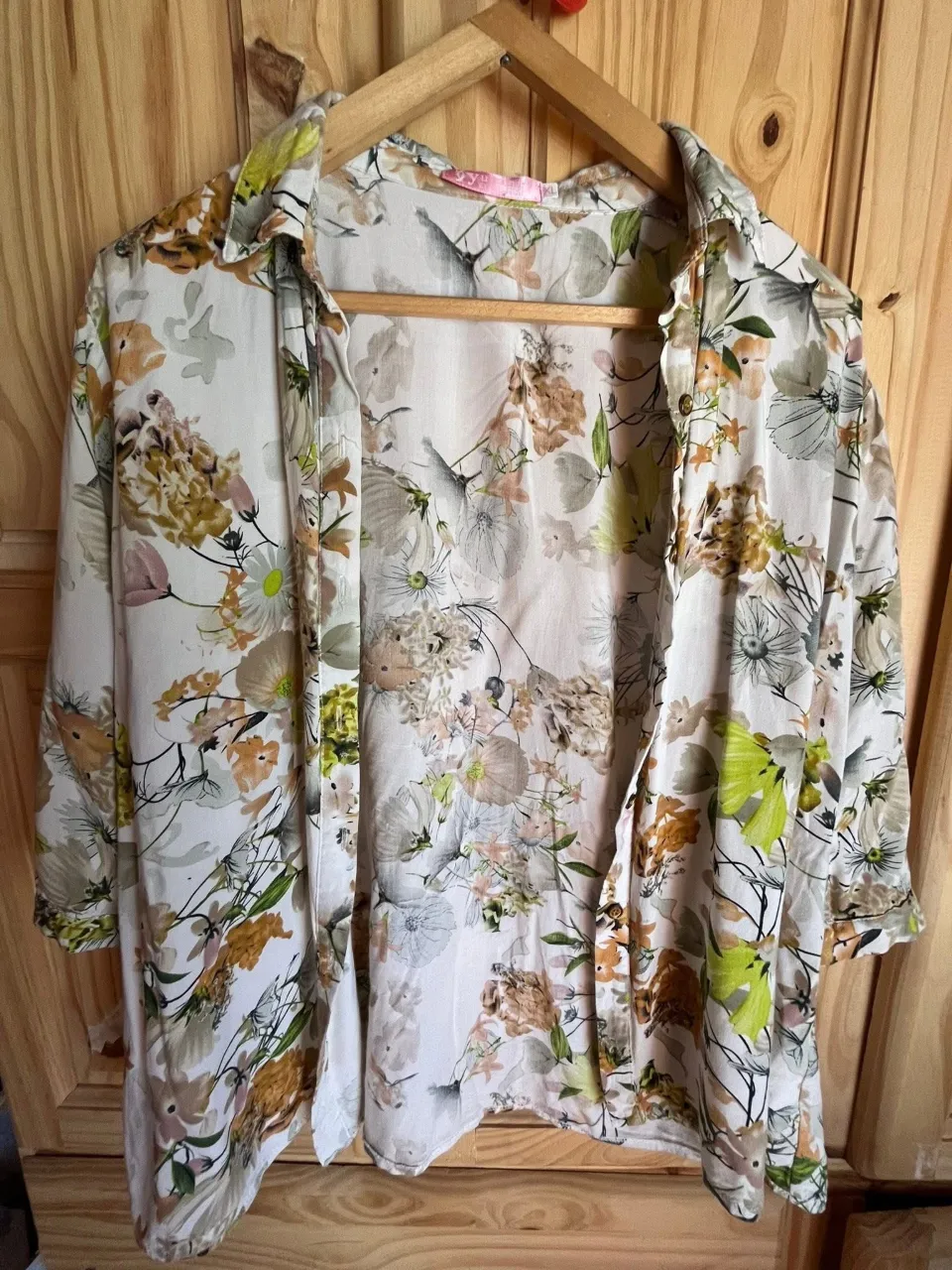 Camisa estampada con flores y hojas en tonos pastel y tierra. Manga corta, ideal para un look fresco y casual.