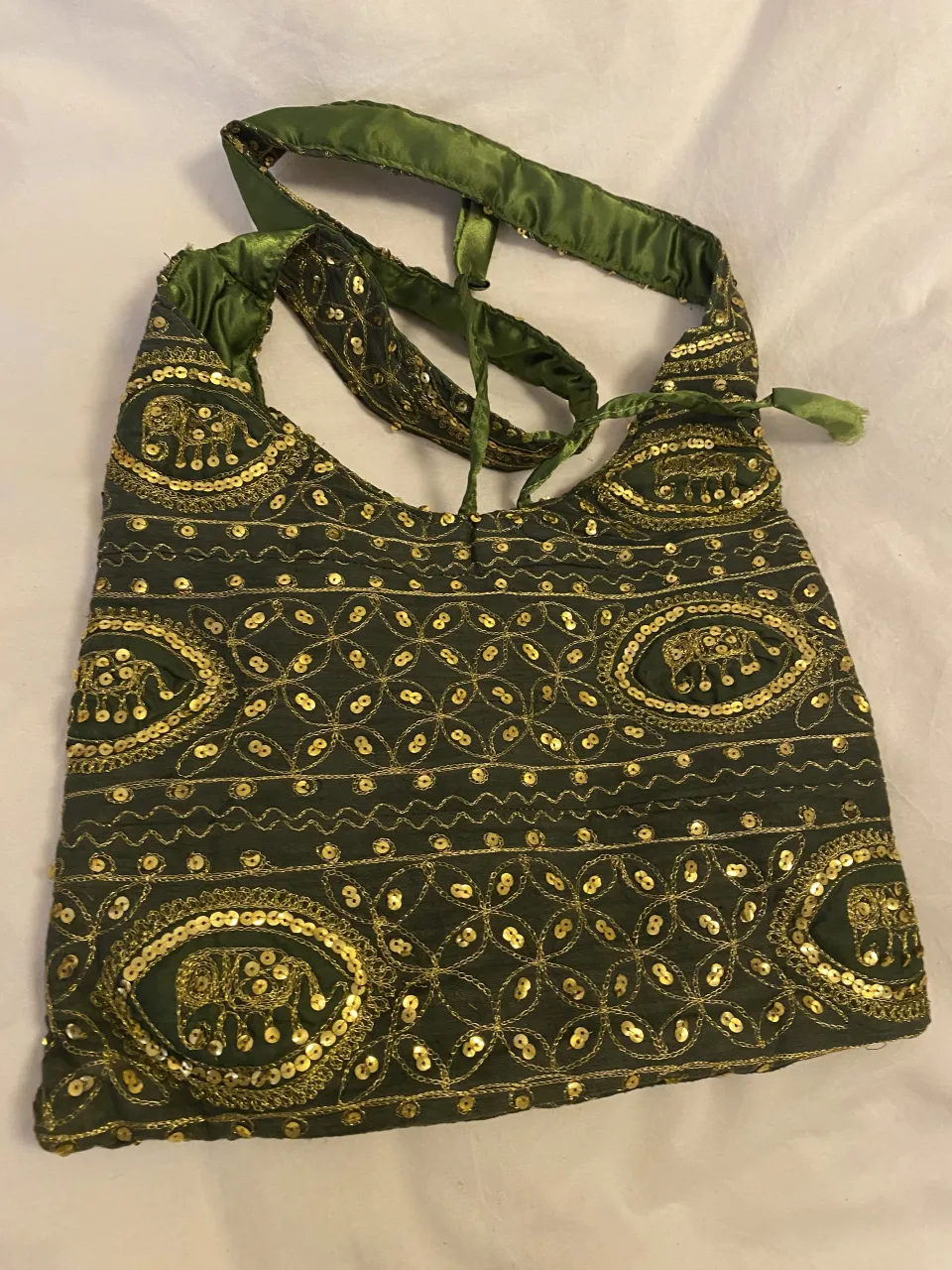 Bolso de mano verde oscuro con bordados dorados y lentejuelas. Presenta un diseño con elefantes y motivos geométricos. Ideal para darle un toque bohemio y original a tu look.