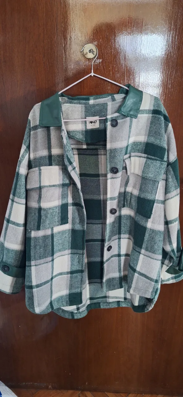 Camisa a cuadros de manga larga con cuello de cuero sintético. Posee botones al frente y en los puños.