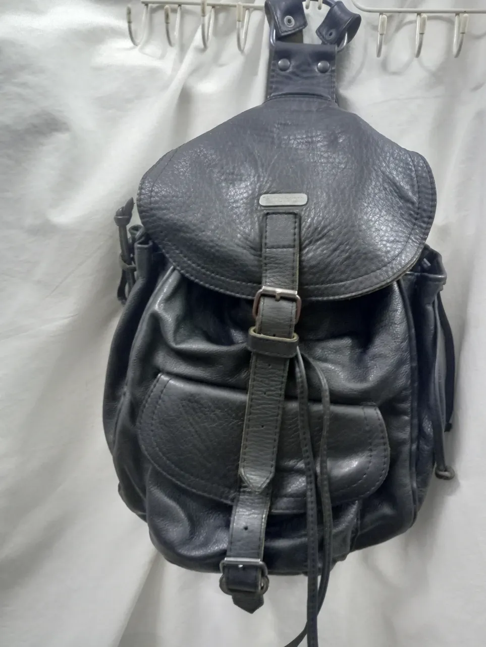 Mochila de cuero negra, súper práctica y canchera. Tiene un bolsillo frontal con tapa y cierre de cordón, y correas regulables. Ideal para el día a día o para darle un toque cool a tu outfit. el interior no está forrado. tamaño mediano