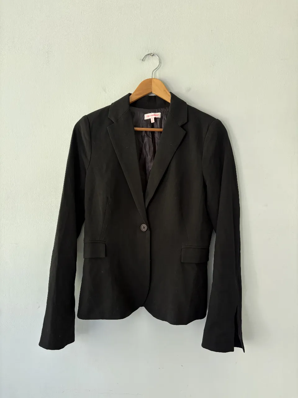 Blazer negro entallado, ideal para un look elegante y formal. Posee un solo botón al frente y bolsillos con solapa. Las mangas tienen un detalle de tajos en los puños, que le dan un toque moderno. Perfecto para usar en la oficina o para una salida.