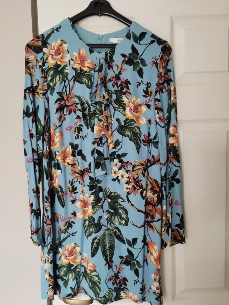 Vestido celeste con estampa floral de hojas y flores en tonos naranja, amarillo y verde. Posee cuello con lazo y mangas largas.