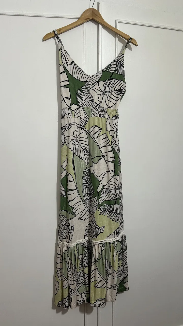 Vestido largo estampado con hojas tropicales en tonos verdes y crudo. Posee breteles finos, escote en V y cintura elastizada. La falda tiene un detalle de volados y terminación con puntilla.