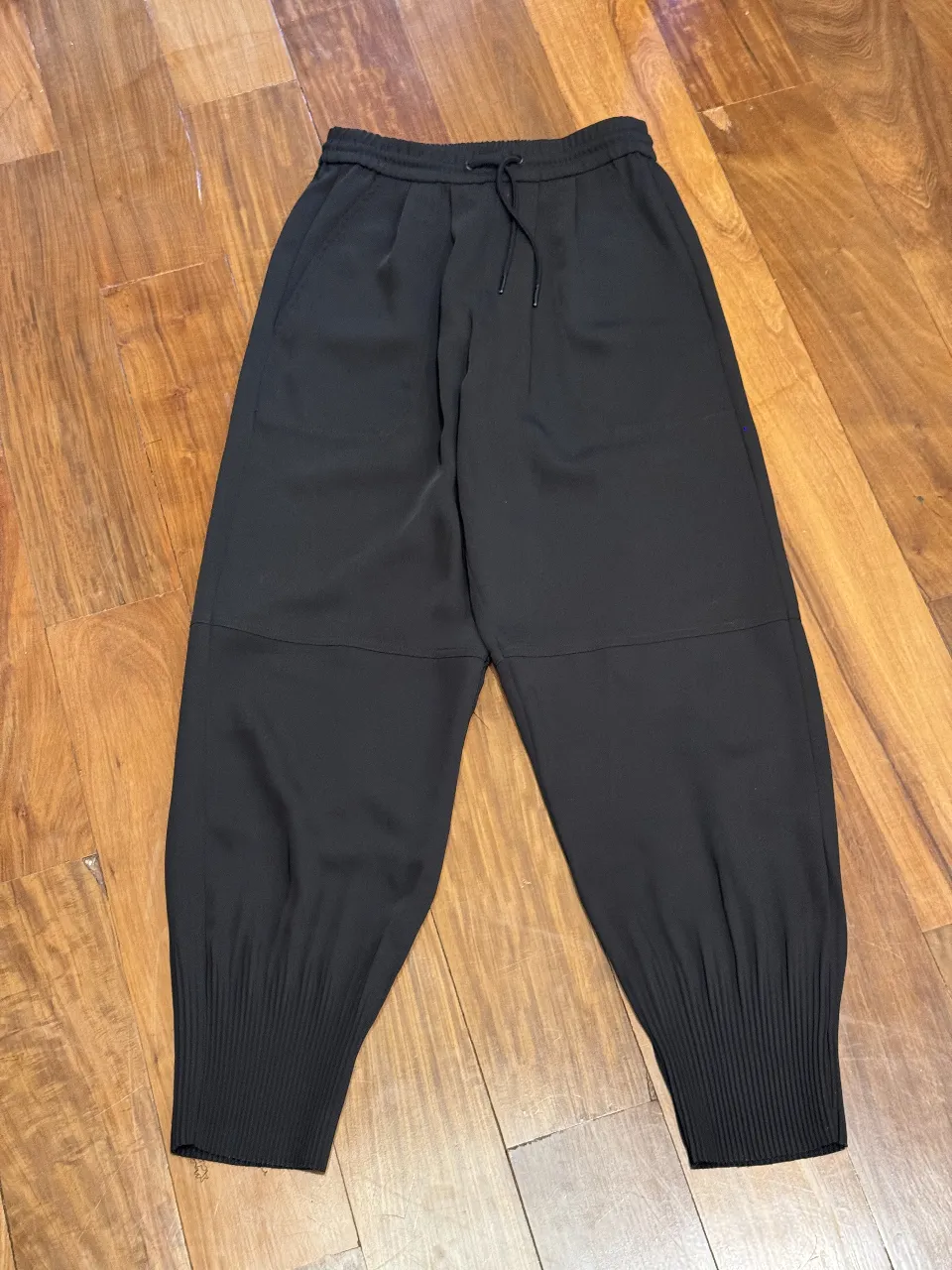 Pantalón negro de corte amplio con cintura elastizada y cordón. Posee bolsillos y puños anchos con terminación acanalada. Ideal para un look moderno y cómodo.