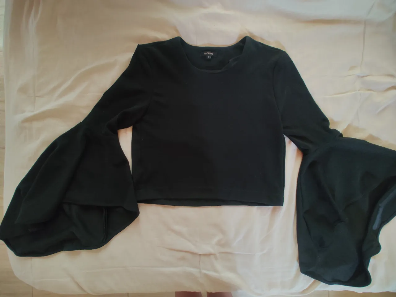Remera negra de manga larga con mangas acampanadas y amplias.