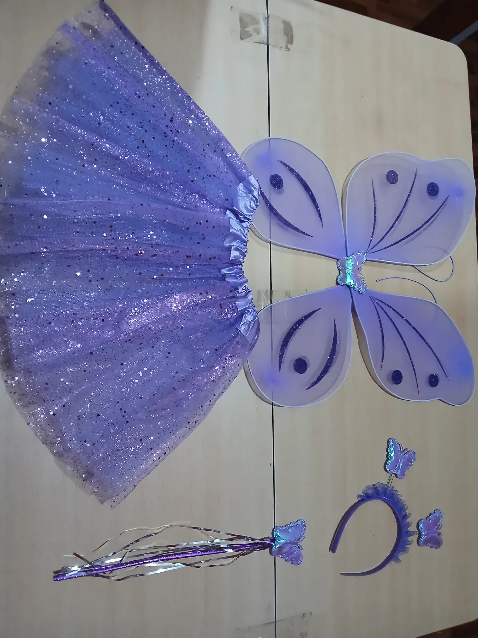 Set de disfraz de hada o mariposa para niña, incluye varita mágica, alas y diadema. Ideal para fiestas temáticas o disfraces.
