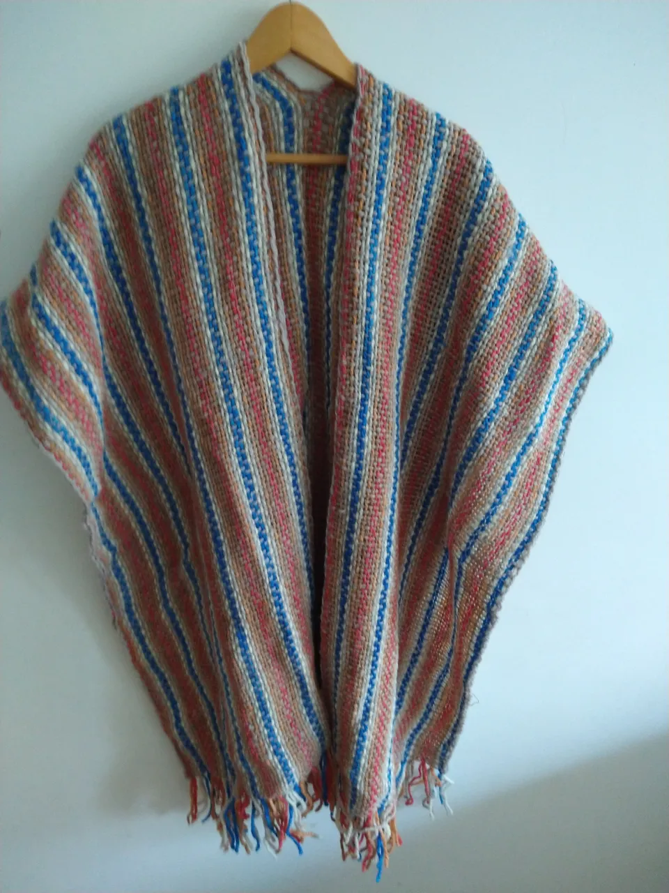 Poncho tejido a rayas verticales en tonos crudo, azul y rojo. Posee flecos en la parte inferior.