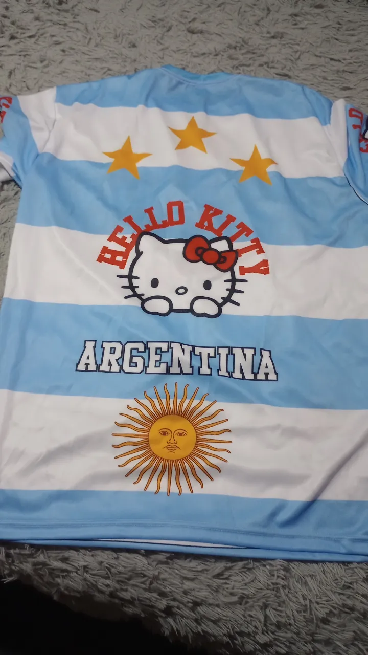 Remera de manga corta con diseño de Hello Kitty y el escudo de Argentina. Presenta franjas celestes y blancas, el sol de mayo y la inscripción "HELLO KITTY AND FRIENDS".