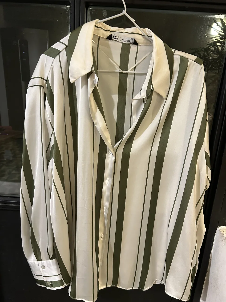 Camisa de seda con rayas verticales en verde y blanco. Posee cuello clásico, botones al frente y puños con botones. Ideal para un look elegante y moderno.