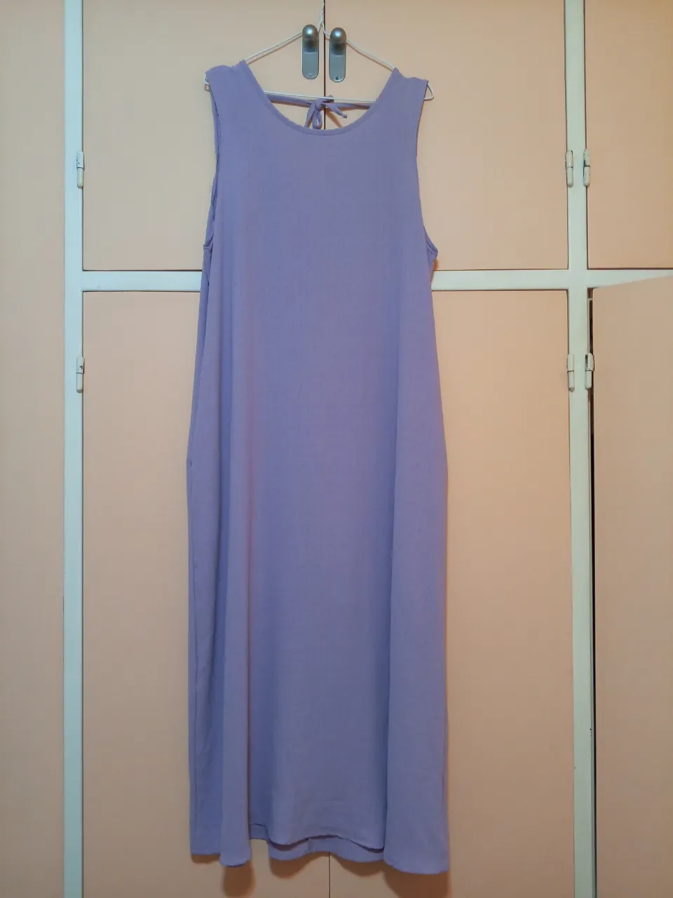 Vestido largo lila, sin mangas y con escote redondo. Posee un detalle de lazo en la espalda. Ideal para un look casual y fresco.