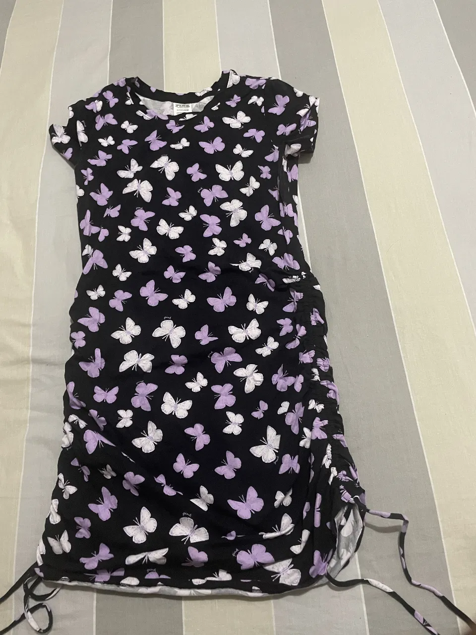 Vestido negro con estampa de mariposas en tonos lilas y blancas. Posee un diseño con fruncido y tiras ajustables a los costados, lo que permite regular el largo y el ajuste de la prenda. Ideal para un look casual y divertido.