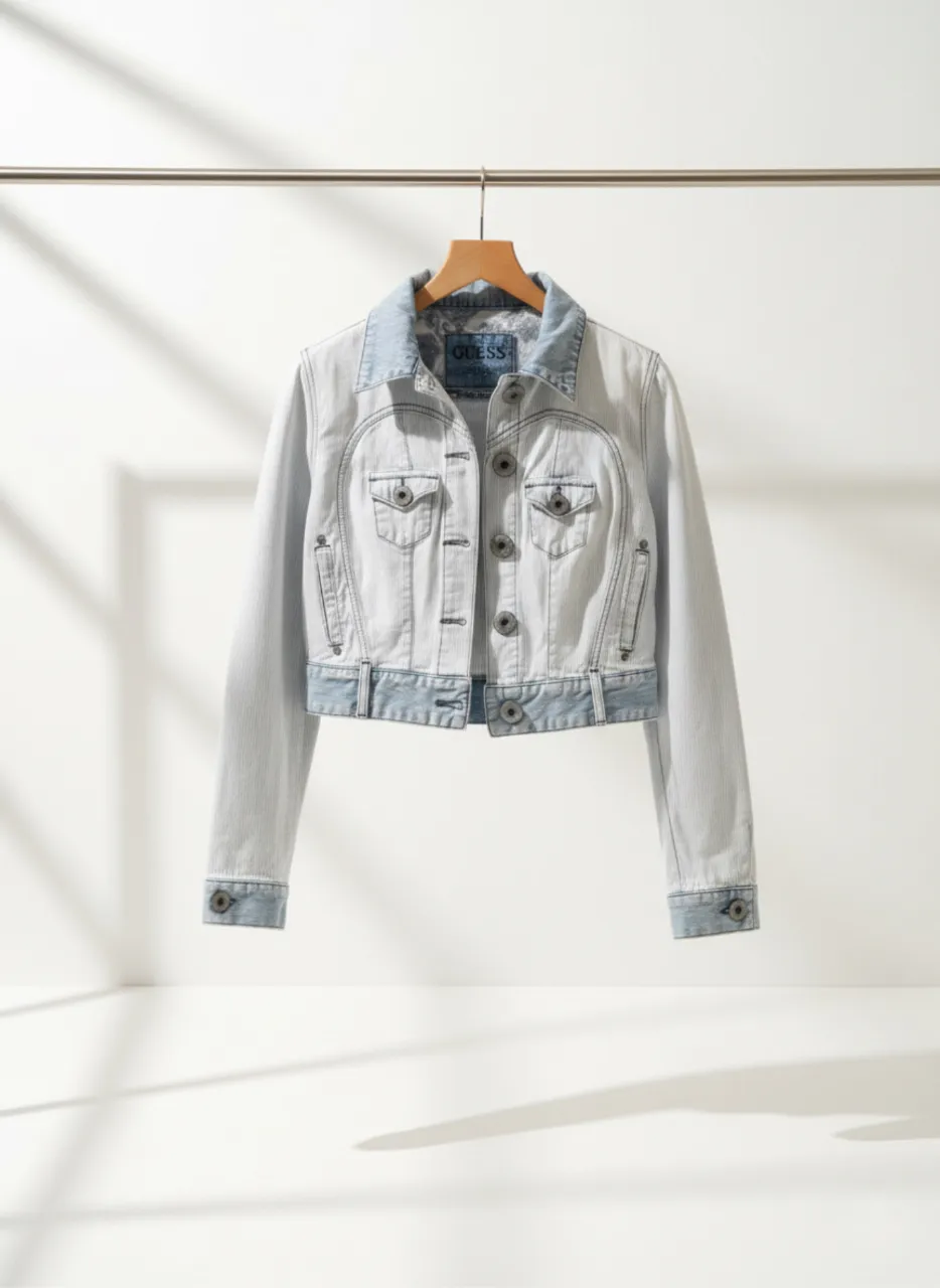 Chaqueta vintage Guess Los Angeles, denim azul con rayas blancas, talle L. Modelo corto, calce femenino y en excelente estado.