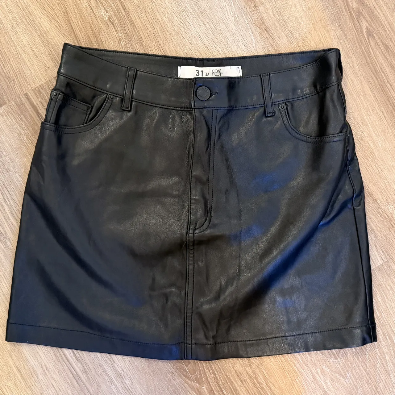 Pollera de cuero negra, tiro alto, con bolsillos y detalles de costura. Un básico que no puede faltar en tu guardarropa, ideal para looks cancheros y modernos.
