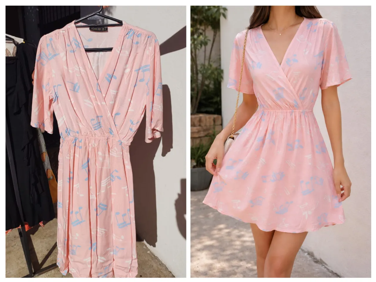 Vestido rosa con estampado de notas musicales en celeste y blanco. Escote cruzado y cintura elastizada. Mangas cortas tipo mariposa.
