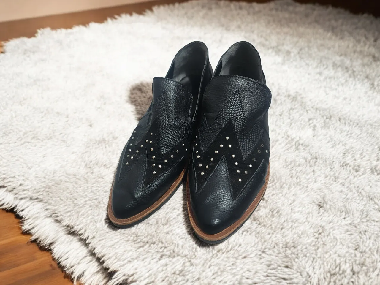 ¡Impresionantes mocasines negros con tachas y diseño zigzag! Perfectos para darle un toque rocker y canchero a tu look. Ideales para salidas informales o para un estilo más audaz.