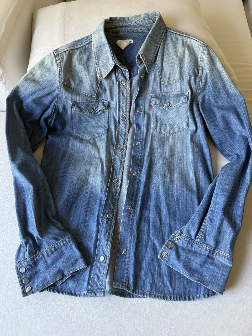 Camisa de jean con degradé de color azul. Posee dos bolsillos en el frente con tapa y botones metálicos. Los puños tienen botones metálicos.