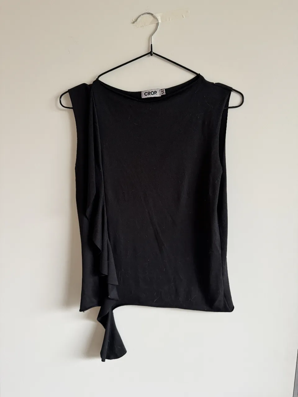 Top CROP con detalle de volados asimétricos en el lateral. Es ese top que levanta cualquier look sin esfuerzo. El volado cae de forma natural, logrando un equilibrio perfecto entre simple, canchero y femenino. Tiene una caída suave, no se ajusta demasiado y acompaña el cuerpo con movimiento🖤Además la tela es súper suave. Atemporal y combinable con todo. Talle M pero la tela cede bastante! Medidas en cm (tomadas en plano - para contorno, multiplicar x2): axila a axila 42, largo total 52, cintura 38. Largo del volado: 65cm.