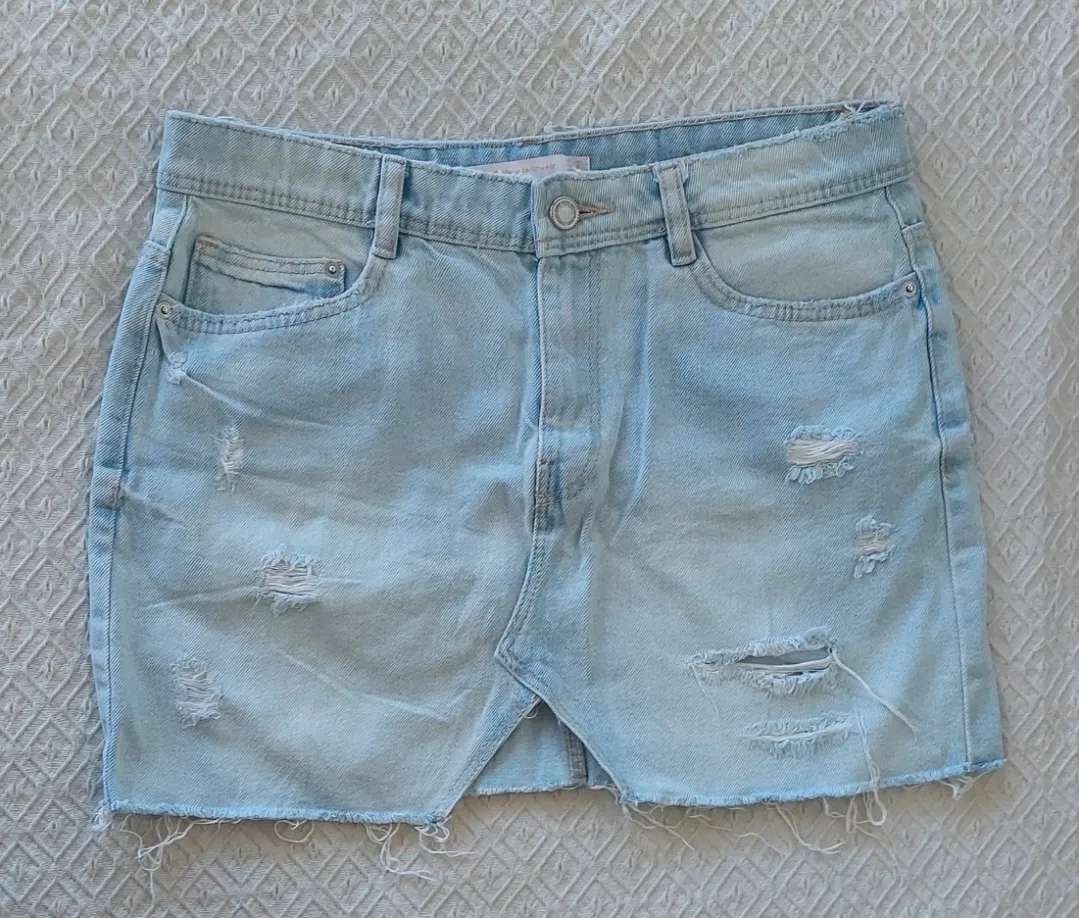 Pollera de jean Zara, con roturas y desgastada. Un clásico que no puede faltar en tu guardarropa, ideal para looks casuales y cancheros.