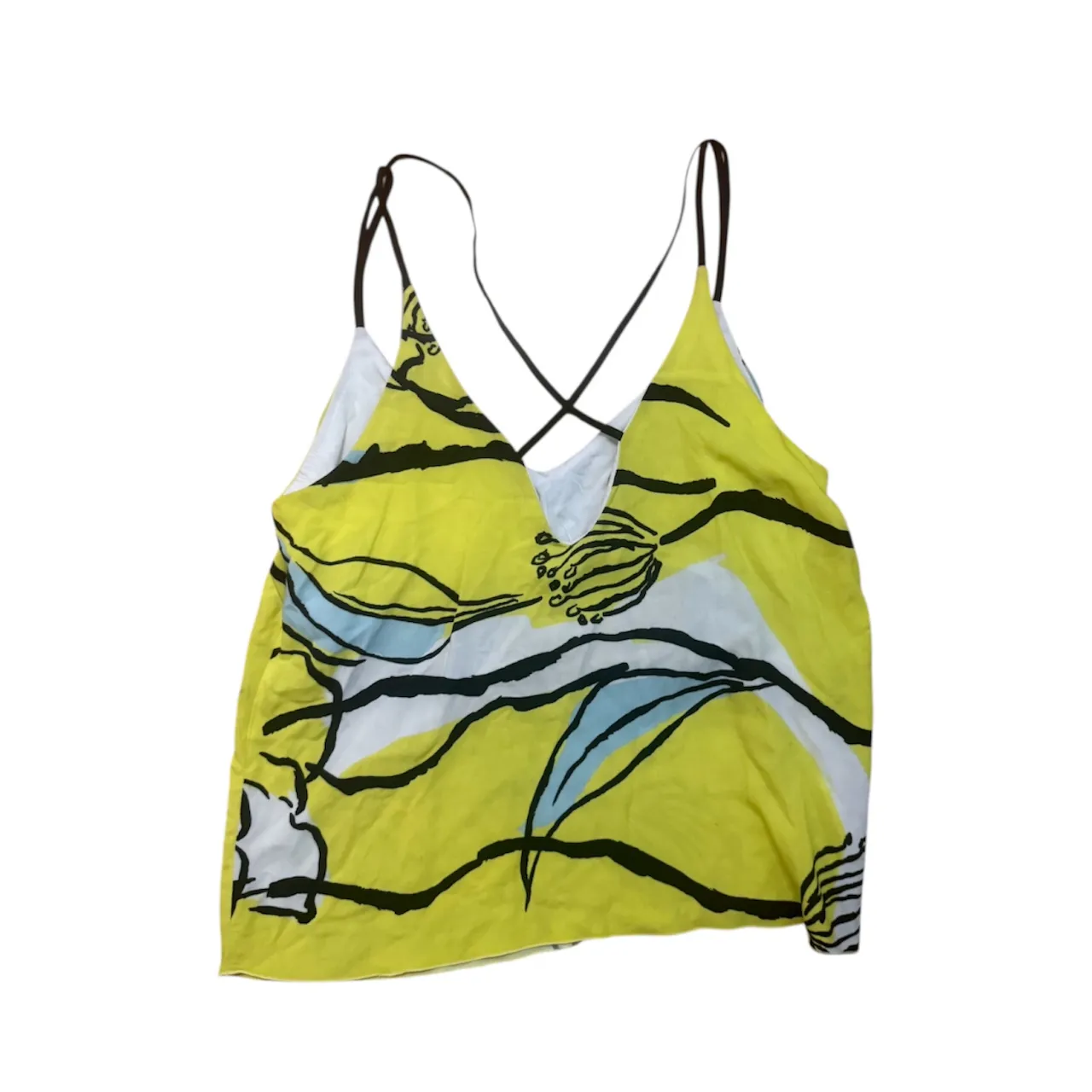 Top amarillo vibrante con estampa floral abstracta en negro y detalles celestes. Breteles finos cruzados en la espalda. Ideal para un look fresco y canchero.