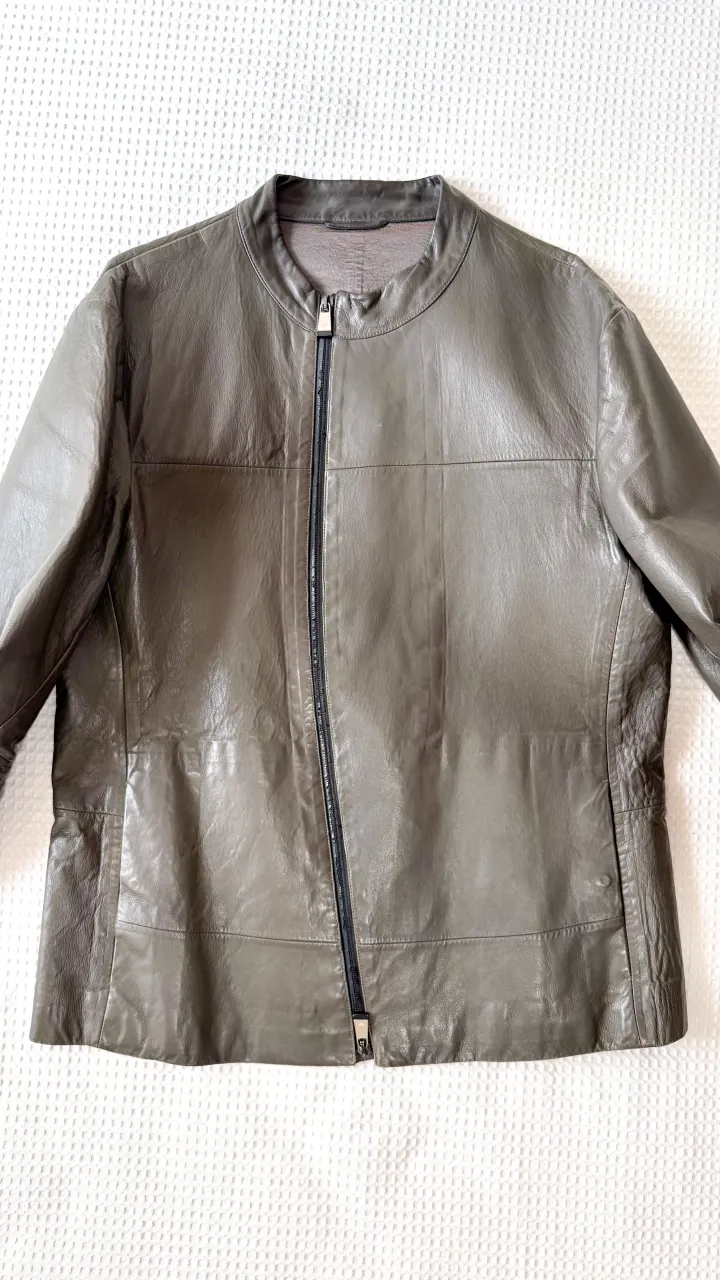 Campera de cuero gris visón con cierre central y cuello mao. Diseño con un entallado moderno y versátil, ideal para completar looks urbanos y elegante. Perfecta para cualquier evento. Con detalle por su uso, pero está súper hermosa 🔥🤍