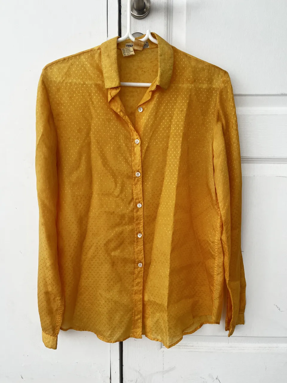 Camisa vintage de seda amarilla con delicado estampado de puntos. Un clásico atemporal para elevar cualquier look.