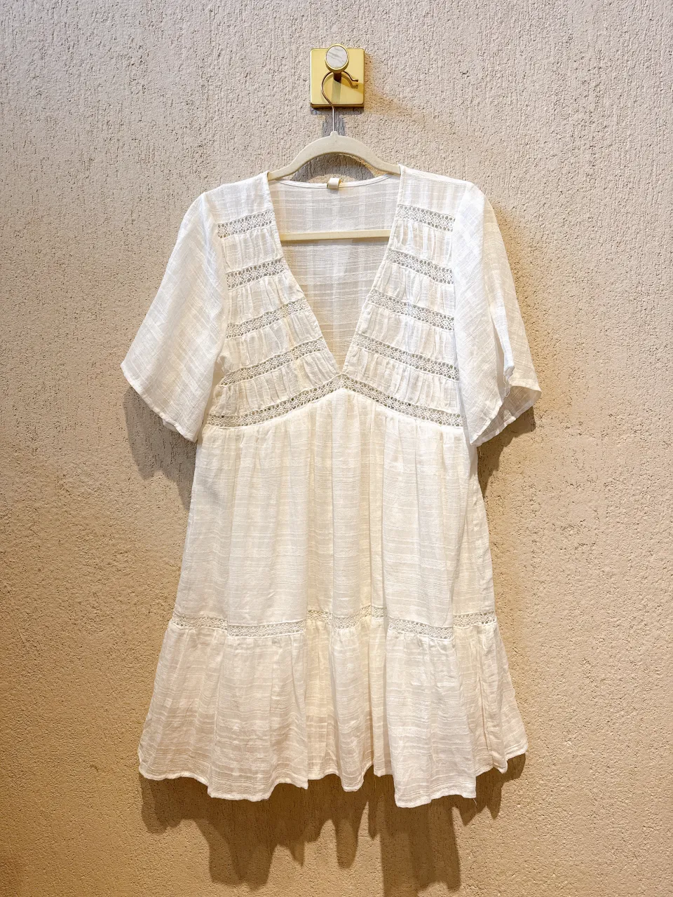 Vestido blanco corto, ideal para el verano. Posee un escote en V con detalles de encaje y tiras finas. La falda es suelta y con volados, perfecta para un look fresco y bohemio. Medidas Largo total 89cm Sisa a sisa 50cm Ancho de hombro 10cm Largo de manga 29cm