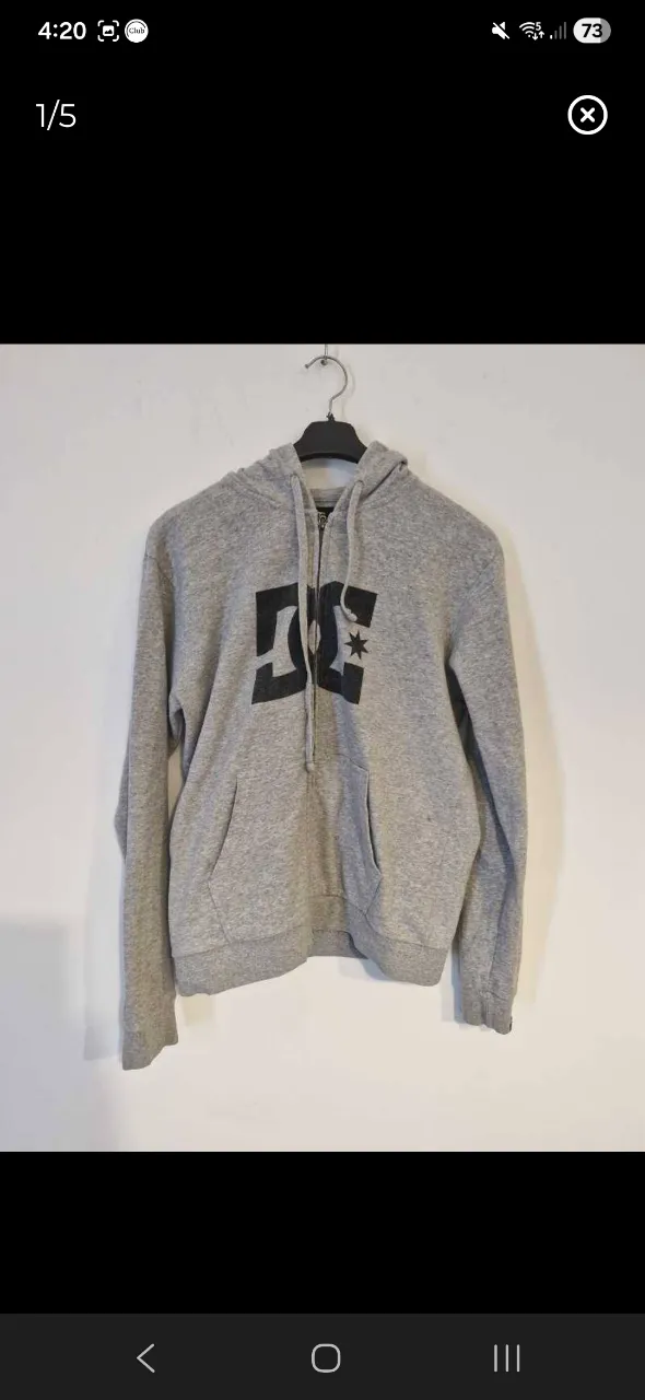 Buzo gris con capucha y cierre, con estampa grande de DC Shoes en el frente. Ideal para un look casual y urbano. con detalles como se observa en la foto 2.