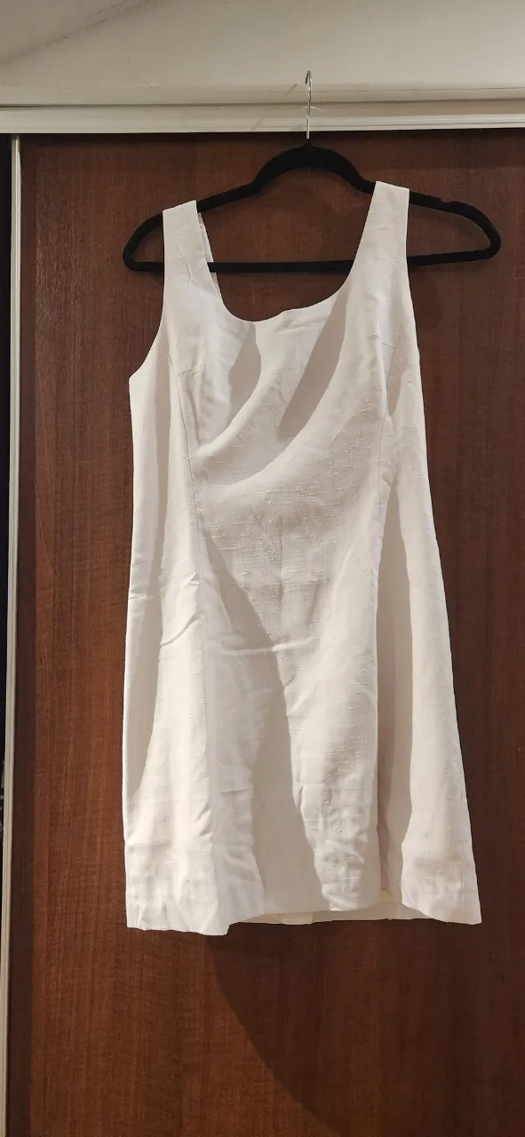 Vestido blanco corto, ideal para eventos de día o para un look casual elegante. Su diseño es minimalista y atemporal, perfecto para combinar con diferentes accesorios.
